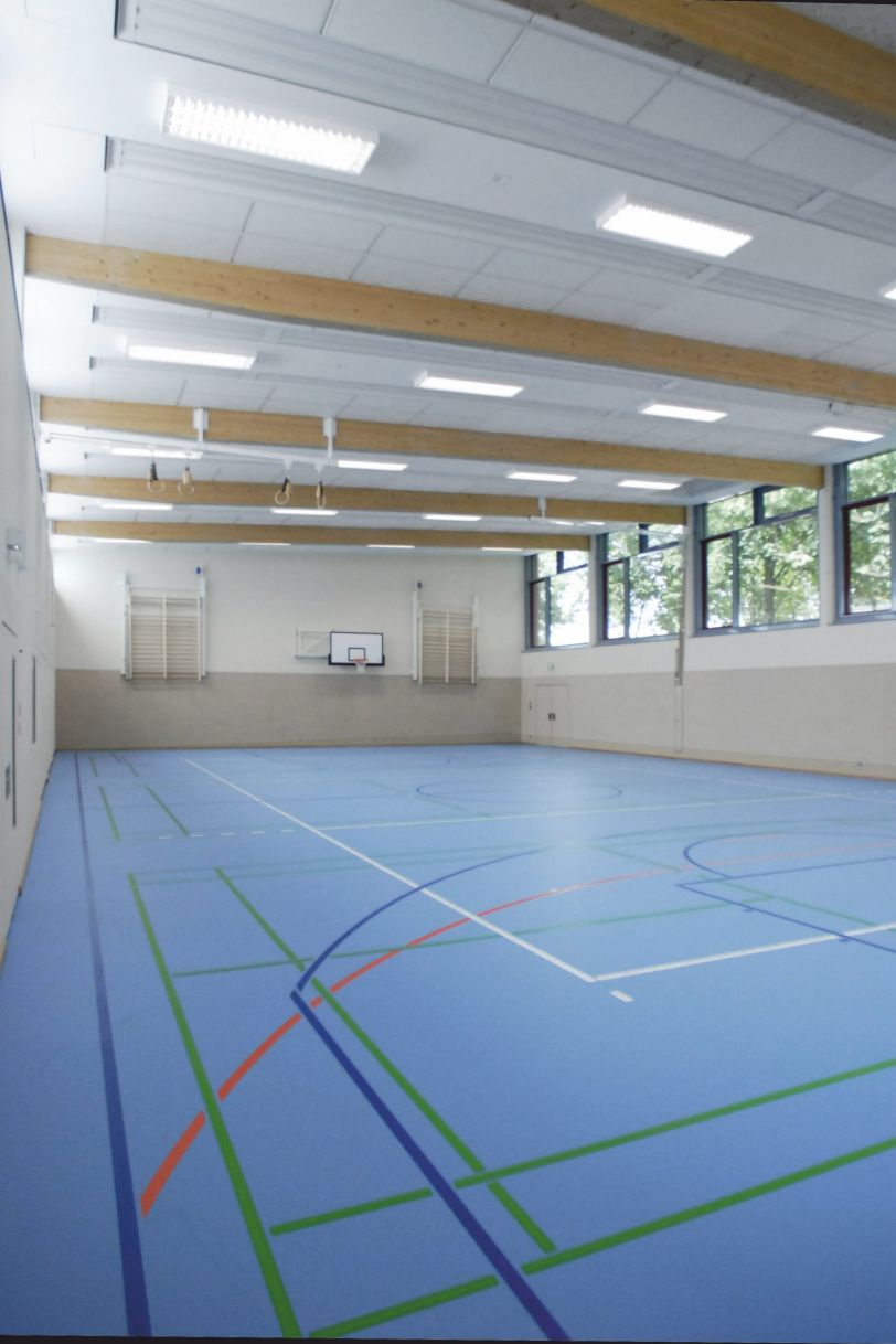 Nach einem Brandschaden wurde diese neue Sporthalle mit einer direkten Verbindung zum Schulgebäude geplant und errichtet. Dabei wurde die Gelegenheit genutzt, die Halle auf eine zeitgemäße Größe anzupassen sowie die Sanitärbereiche der Schule neu zu ordnen. Das Gebäude passt sich mit seiner roten Verblendfassade dem schulischen Bestand sowie der dörflichen Umgebung an.